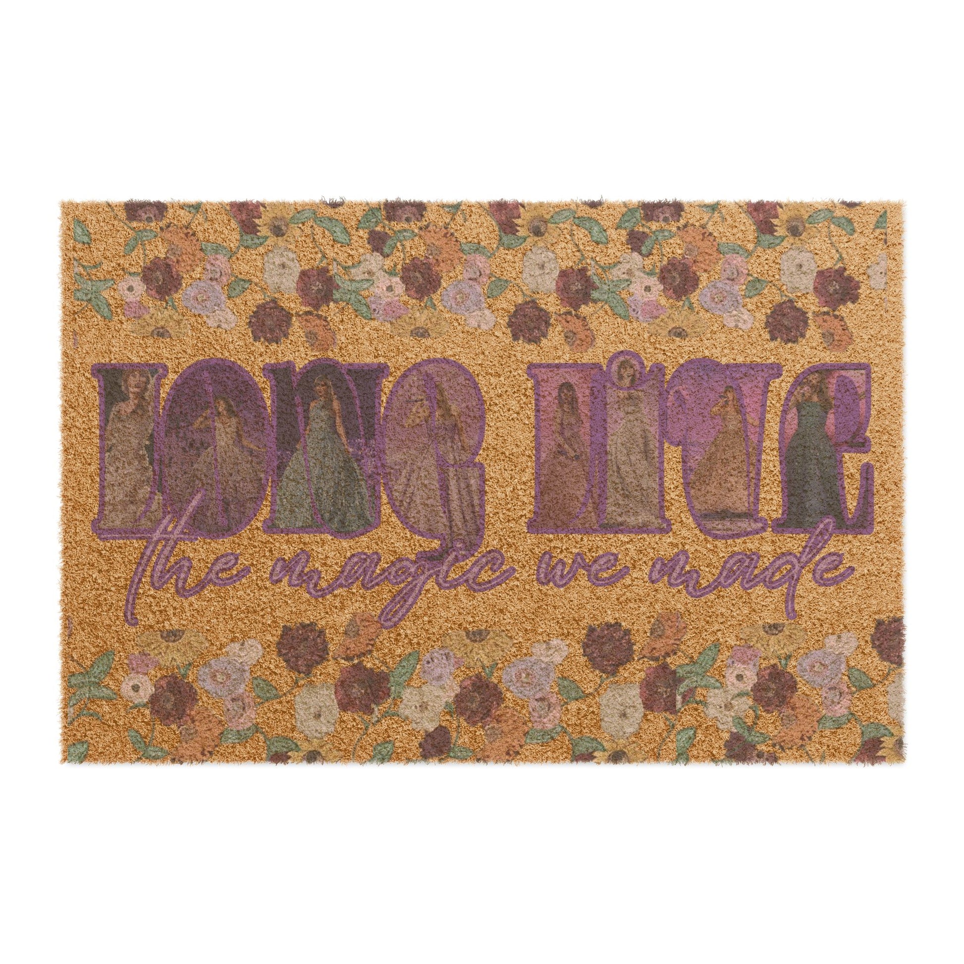 A warmly textured coir doormat that greets guests with a vintage-inspired floral print and soft handwritten script. The natural coconut fibers trap dirt and moisture while the sturdy black vinyl backing holds the mat steady on porches and entryways. Sized to fit most doorways, this mat brings a cozy, handcrafted feel to mornings and twilight arrivals — the muted purples and earth tones blend with rustic or cottage decor and add a subtle touch of personality to your threshold.